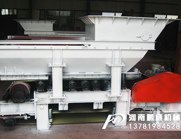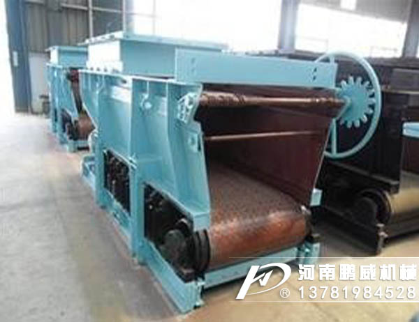 料倉內的物料經連接段進入導料槽落在甲帶上,甲帶靜止時物料最終靠內摩擦力而停止運動,在出料口形成一定的角度的靜止角度堆積;當驅動滾筒在外力的驅動下開始旋轉時,帶動膠帶運動,膠帶帶動其上的甲帶運動,甲帶帶動其上的物料導向出料口,運行中的甲帶在出料口卸載后轉向回程,物料不斷從出料口排出,完成給料過程;二次密封裝置對從導料槽和膠帶之間間隙中漏出的物料提供密封;改變給料量,可通過調節(jié)轉臂行星摩擦式無極變速機的調速手輪來改變輸出軸轉速,改變甲帶運行速度的大小,從而改變給料量;改變給料量,也可通過選配變頻器,改變電動機轉速,從而改變給料量。