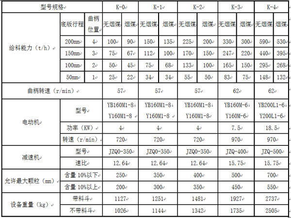 K型往復(fù)式給煤機由機架、底板(給煤槽)、傳動平臺、漏斗、閘門、托輥等組成。當電機開動后經(jīng)彈性聯(lián)軸器、減速機、曲柄連桿機構(gòu)拖動傾料5°的底板在輥上作直線往復(fù)運動,煤均勻地卸到其他設(shè)備上。