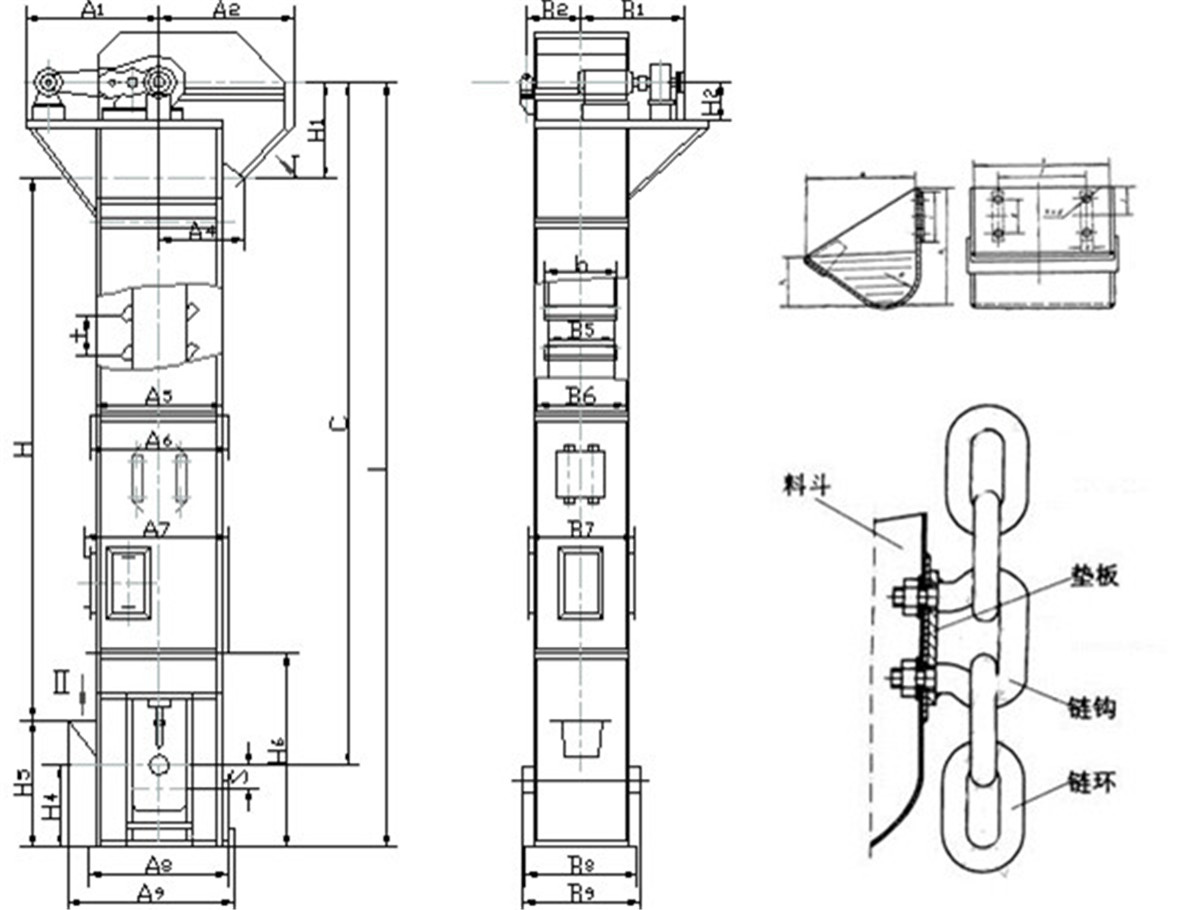 環(huán)鏈斗式提升機由運動部分(料斗與牽引鏈條)、帶有傳動鏈輪的上部區(qū)段、帶有拉緊輪的下部區(qū)段、中間機殼、驅(qū)動裝置、逆止制動裝置等組成。本提升機的料斗為間斷式布置,利用“掏取法”進行裝載,“離心投料法”卸料。本斗式提升機的牽引機構(gòu)是兩根環(huán)形鏈條.我公司生產(chǎn)的環(huán)鏈斗式提升機,由運動部分(料斗與牽引鏈條)、帶有傳動鏈輪的上部區(qū)段、帶有拉緊輪的下部區(qū)段、中間機殼、驅(qū)動裝置、逆止制動裝置等組成。本提升機的料斗為間斷式布置,利用“掏取法”進行裝載,“離心投料法”卸料。本斗式提升機的牽引機構(gòu)是兩根環(huán)形鏈條。